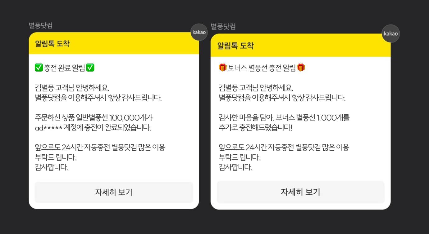카카오톡을 통해 실시간으로⚡별풍선부터 구독권, 퀵뷰까지 고객이 언제 어디서나 온라인, 모바일커머스채널을 통해 상품을 선택하고, 주문/충전내역은 결제와동시에 고객에게 카카오톡"채널"을통해알림톡으로 실시간발송됩니다.